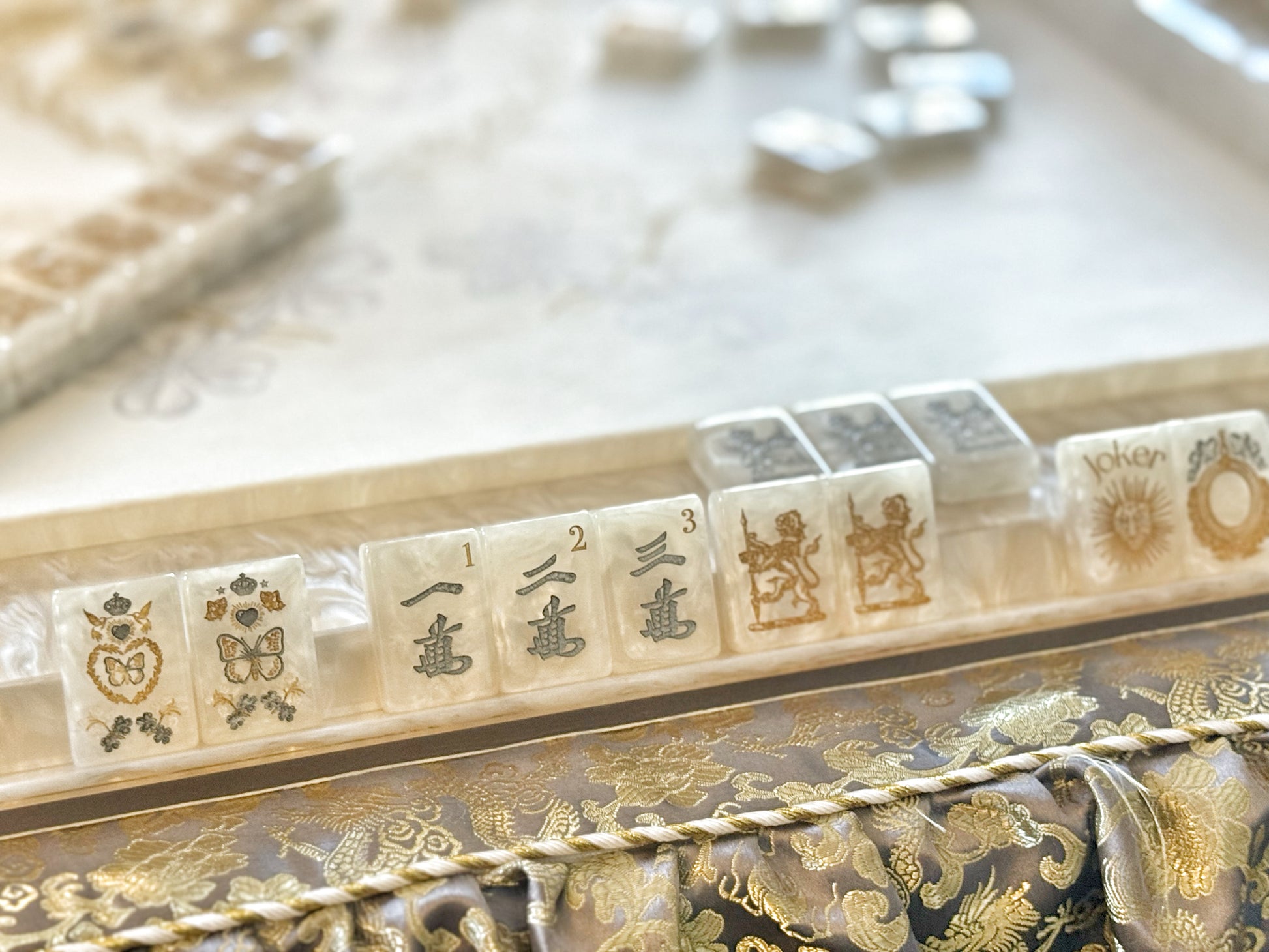 The D'or Leatherette Mat is the perfect accompaniment to the Club Mah Jenn Luxury tile collections. Featuring an exquisite floral motif and jewel toned hues, this mat provides a refined and elegant setting for your bespoke mahjong tiles. Crafted from a featherlight, ultra-thin faux leather, it is exceptionally portable and effortlessly maintained. Waterproof and easy to wipe clean, it sidesteps the inconvenience of playing on damp surfaces as accidents do happen when having fun.