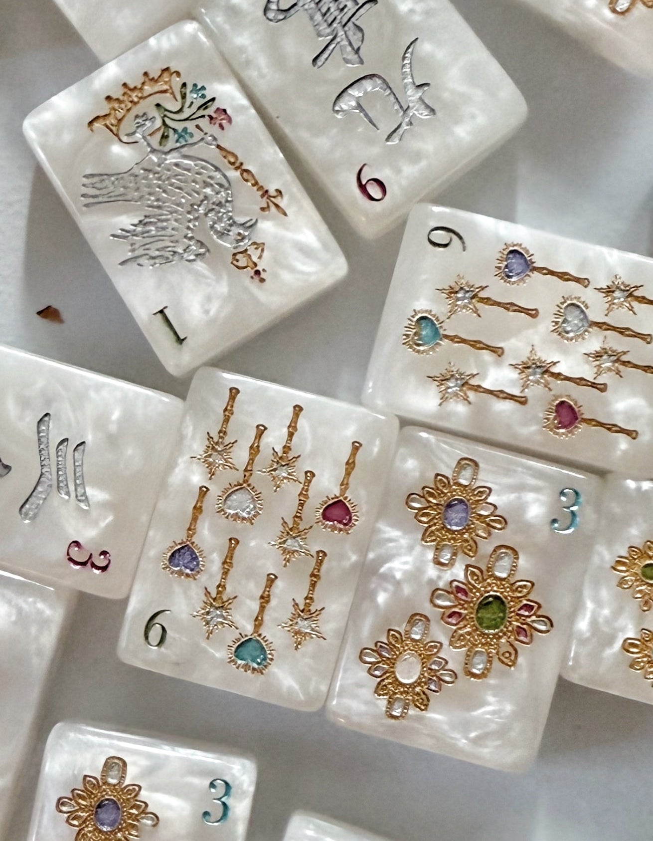 Our D’or White Mother of Pearl Mah Jong tiles are exquisitely handpainted in lustrous metallic Jewel Tone hues, making each piece a unique masterpiece. Crafted from solid mother of pearl resin with meticulous hand detailing, these tiles represent the pinnacle of mah jong luxury. Elevate your game to regal status with a set truly unparalleled. Complete your collection with our sumptuous Italian velvet storage bags, designed to safeguard your Club Mah Jenn treasures in style.