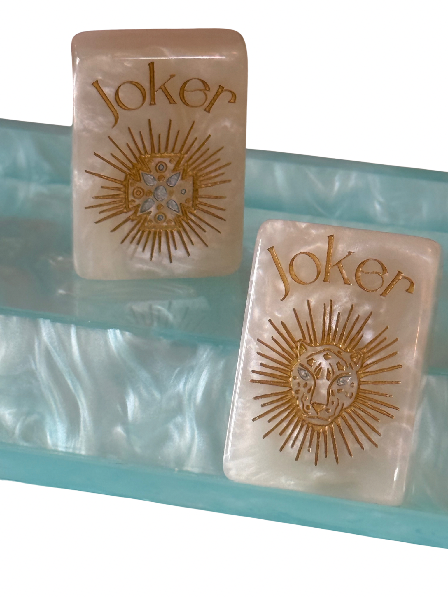 Indulge in the pinnacle of opulence with our D'or Mother of Pearl racks, perfectly complemented by any of our Luxury mahjong tiles. This exquisite pairing crafts a lavish pearl-on-pearl tableau that is simply irresistible to the discerning eye. Each set features four racks, each measuring an elegant 20 inches to effortlessly showcase our Luxury Size mahjong tiles. Their magnetic attachment has quite the snap for a super strong attachment. Elevate your collection further by acquiring our Italian Velvet Storage bags, designed to safeguard these coveted Club Mah Jenn essentials with the utmost sophistication.