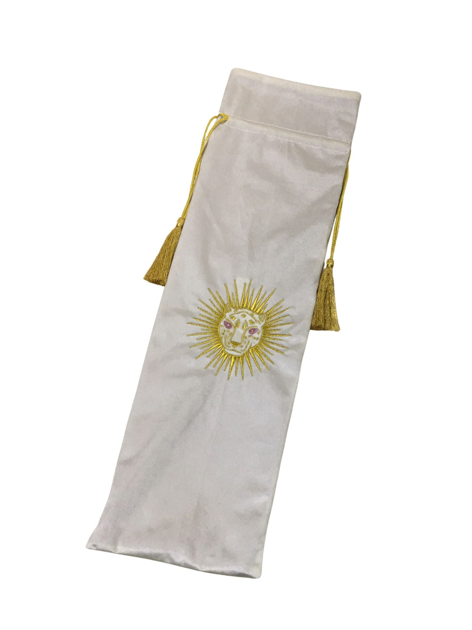 Our impeccably designed ivory velvet rack bags feature a sumptuous raspberry satin lining and are adorned with our luxurious cheetah joker motif, crafted in the finest metallic threads. The gold metallic tassels on the gilded drawstring closure elevate its already lavish appeal. Perfectly tailored to protect our Luxury Mother of Pearl and Mirrored racks, each bag offers a generous compartment with a satin divider to ensure your precious racks remain flawlessly secure and shielded from scratches. For the ultimate care of your cherished game essentials, we recommend pairing this rack bag with our equally opulent velvet tile, mat, and tote bags—each satin-lined in unique shades to preserve the splendor of your distinguished Club Mah Jenn collection during travel.