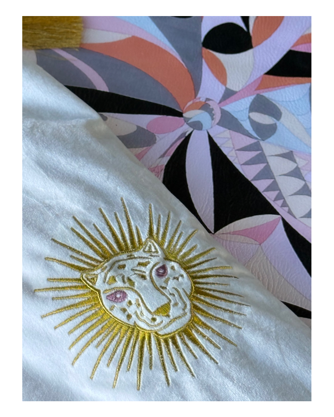 Our decadently crafted ivory velvet bags boast lavish satin linings. the tile, rack & mat bags have jewel toned satin linings while the tote bag has an elegant ivory satin lining. All bags are embellished with our opulent cheetah joker motifs, woven in the finest metallic threads. The gold metallic tassel adorning the zipper & drawstring closures enhance their ,already extravagant charm. Designed flawlessly to safeguard our Luxury Mother of Pearl Mah Jong Tiles,Racks, & Mats,